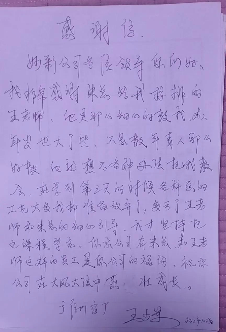 妙彩金饰画项目采用了整项目输出的模式,除了设备、运营、售后等,技术学习及结业考试也是重中之重,只有掌握了全部的技术,才能发挥妙彩金饰画百分百的实力,所以每天妙彩金饰画都有许许多多的学子不辞辛苦的努力学习、考试结业;客户王先生也是其中一员,由于王先生年龄稍大,所以在学习上稍逊年轻学员,不过在众位老师、经理的协同帮助下,王先生还是在一周之内完成了结业考试,顺利结业,并写下了这封感谢信表达其感激之情。