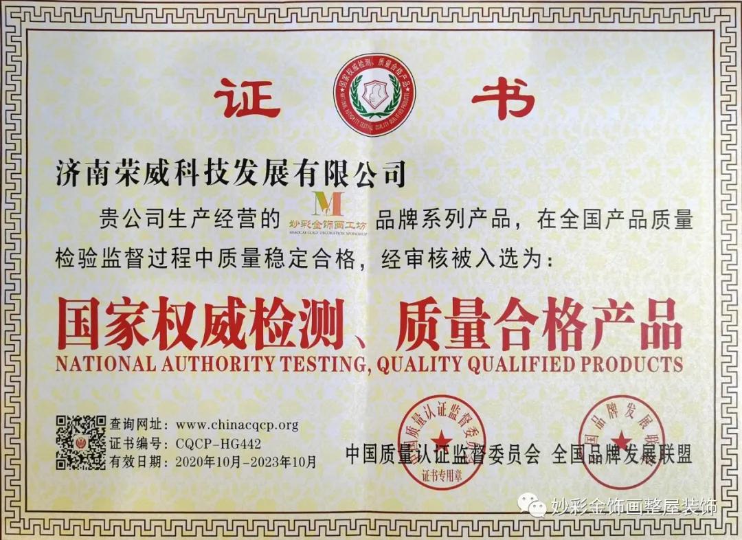 据了解,中国质量认证监督委员会是中国名牌发展领域中全国性、专业性的品牌综合管理机构,是全国企业、品牌评定资质的合法机构;本次妙彩金饰画斩获的《国家权威检测质量合格产品》荣誉,是中国质量认证监督委员会通过对妙彩金饰画产品的反复测试,而得出的权威认可。