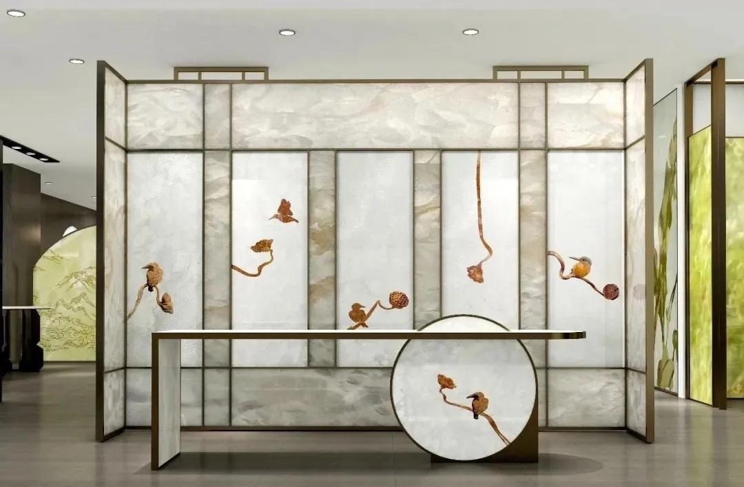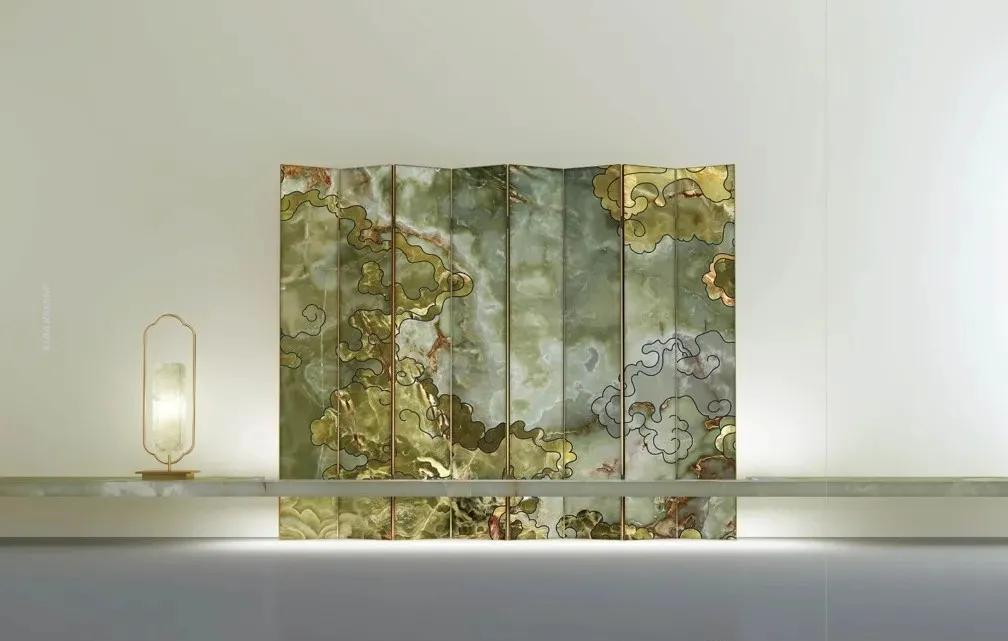 妙彩仿玉石屏风将仿玉石工艺与屏风工艺相结合,外表晶莹剔透、白璧无瑕,在巧妙地创造出丰富的空间层次之余,更营造出高贵浪漫的空间气质。屏风能随时开合、移动、折叠。比墙更灵活、通透,比帘子郑重静美。