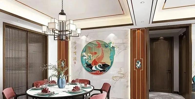 这组“飞黄腾达”背景墙,是妙彩结合中华传统的吉祥寓意设计而成,下是深绿色调木纹底板,上是爵士白底纹搭配着国潮元素凤跟鹤,下方设计寓意财源滚滚的海浪,寓意飞黄腾达,餐厅设计最具国潮性代表色调整体护墙板造型,中间搭配自古以来就深受人们喜爱的鲤鱼,它们有着吉祥、富足、年年有余的寓意,装在餐厅再合适不过了。