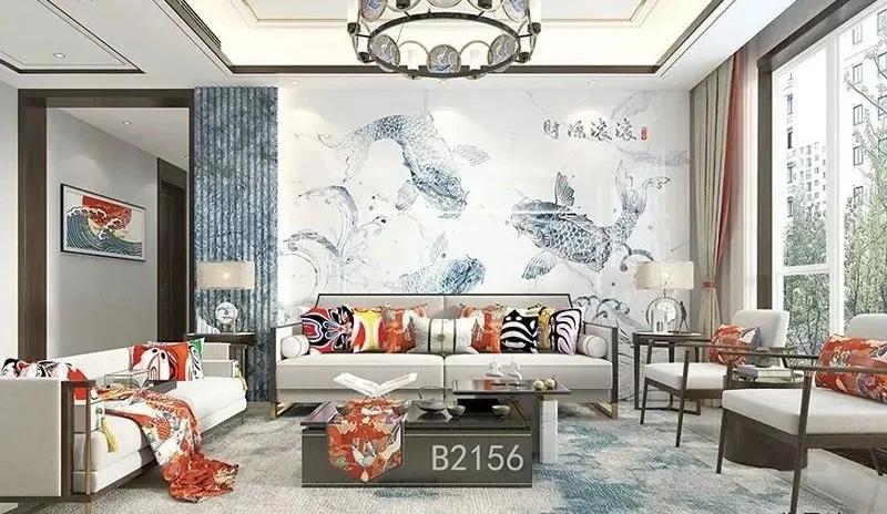 这组“财源滚滚”背景墙,是妙彩将当下最流行的悬空背景墙与中华传统文化元素结合打造而成,背景墙墙面采用作为中国传统文化的精粹、蕴藏着浓厚的文化思想的戏曲素材,尽显中华传统之美,沙发背景时尚的悬空造型搭配象征美好祥和的鲤鱼,以水墨形式呈现,极具有中华传统文化风采,两者相互搭配,使整个客厅充满了国潮气息,使人眼前一亮。