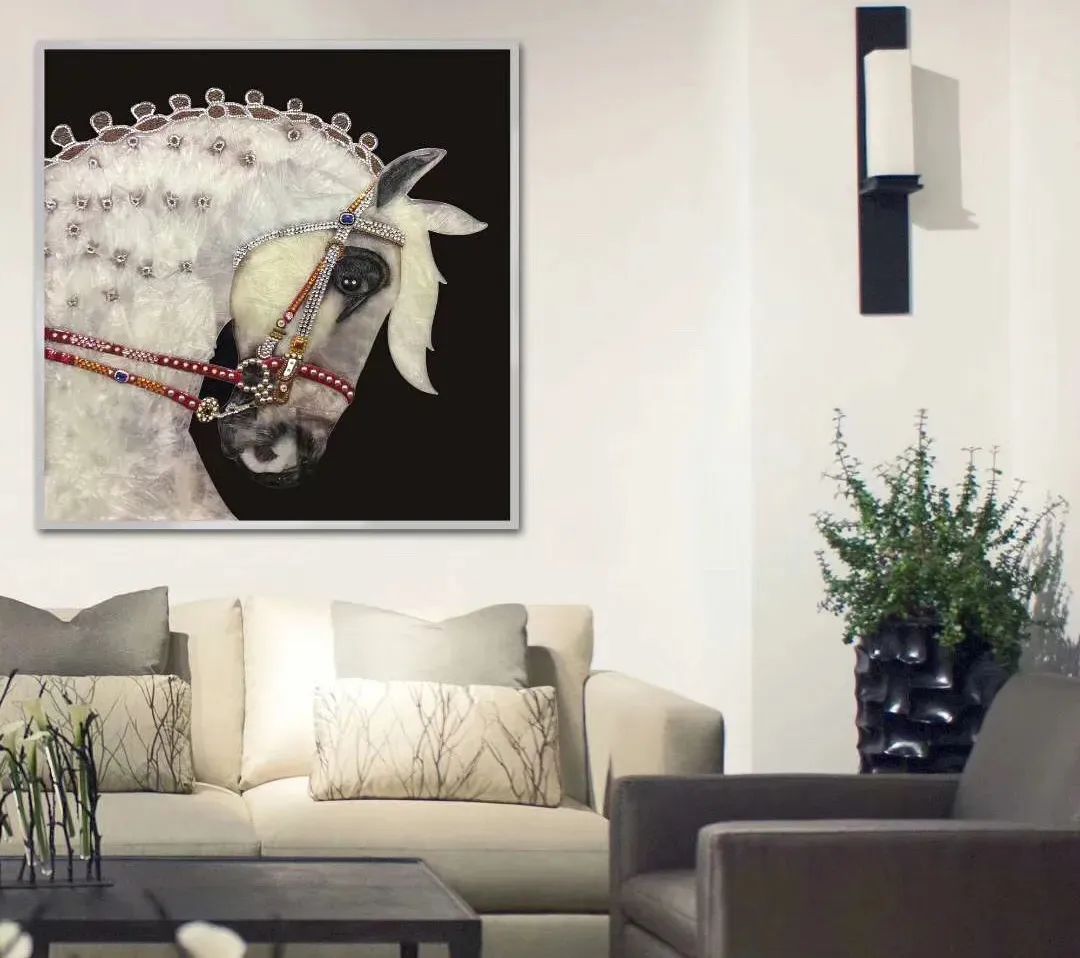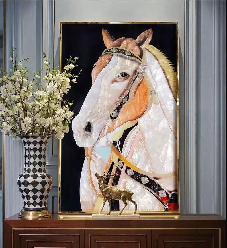 掐丝珐琅画的制作由备胎体与珐琅釉料、掐丝造型、点施釉彩、烧制、后期处理等多道工序完成,在视觉上有着五彩斑斓、华丽夺目的艺术特点,当用于室内陈设以及空间环境的装饰时,可赋予空间品质与内涵,使环境氛围获得审美的提升,给生活环境以艺术化。