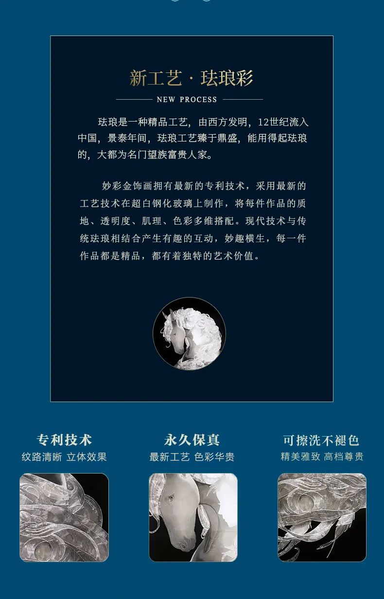 妙彩掐丝珐琅画采用了最新的专利技术,相比起其他现代珐琅,色彩更加绚丽、光泽更加闪亮,还具有耐腐蚀、耐磨损、耐高温、耐水侵、永不褪色、永保光泽的特点,历经千百年也不会老化变质,既实用又保值,作为工艺收藏品也是很好的选择。