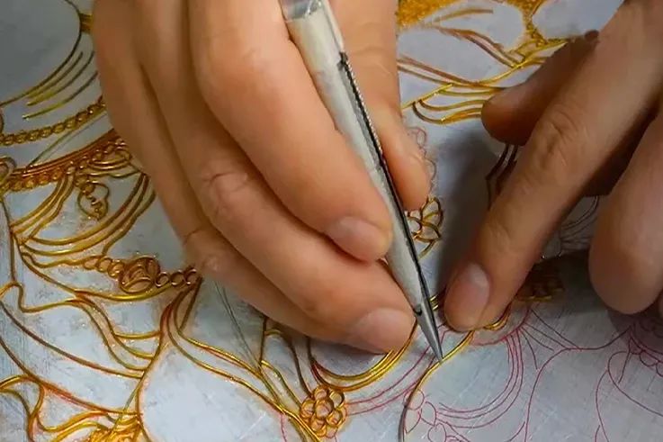 传统的掐丝珐琅要经过手工掐丝来塑造图案,其工艺严谨细致,耗时长久,且成品十分昂贵,已经完全脱离现在的市场实际需求;妙彩金饰画为了解决珐琅画的市场现状,将专利技术与传统珐琅工艺相结合,成功推出了妙彩掐丝珐琅画。