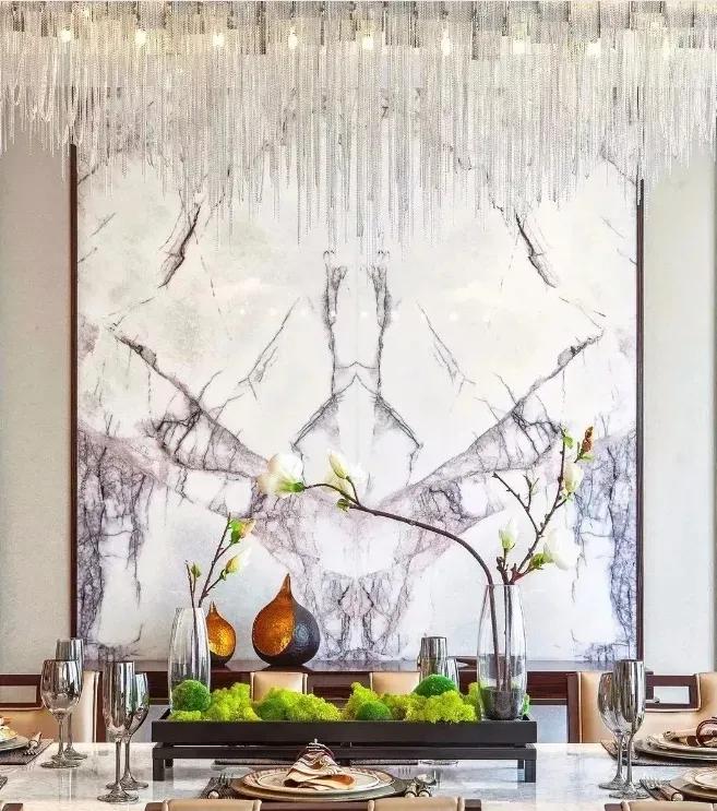 大理石背景墙:风格多样、纹理自然、高档大气,表面光洁,具有很好的触感,防火防潮,不易损坏、易清理保存时间长久;但具有一定辐射性,造价昂贵,施工难度较大。